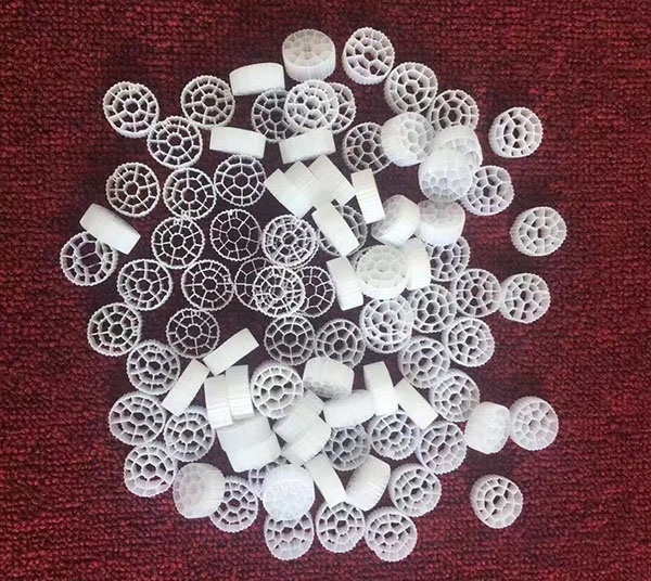 流化床填料又稱MBBR填料應用于好氧生物流化床工藝中,流化床填料(MBBR)采用立體空心結構為好氧生物載體,正常運行過程中填料懸浮在水中。填料內部生長厭氧菌,產生反硝化作用可以脫氮;外部生長好氧菌去除有機物,整個處理過程中同時存在硝化與反硝化過程。流化床填料(MBBR)工藝技術具有容積負荷高的特點,因此流化床填料(MBBR)工藝可以有效的減少池容積。
