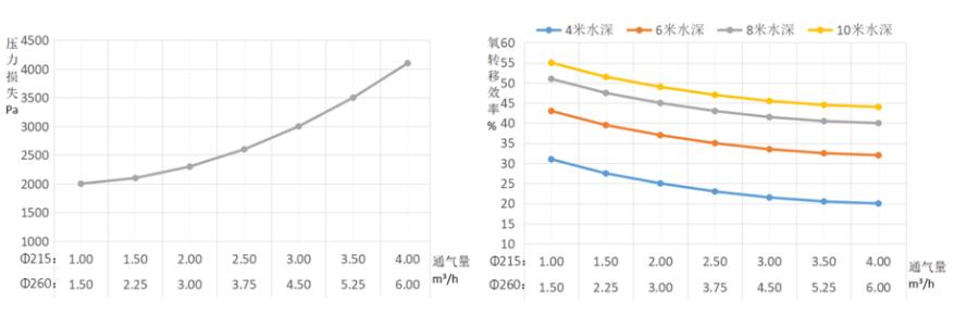 | 規格 | 外徑 (mm) | 膜片直徑 (mm) | 通氣量 (m3/h) | 標準通氣量 (m3/h) | 服務面積 (m2) | 氧轉移效率 (%) | 接口(螺紋外絲) |